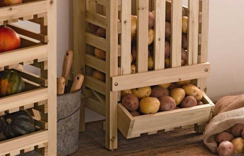 Можно перекладывать клубни хвойными лапками или хранить картошку в ящиках, сделанных из свежих еловых или сосновых досок.