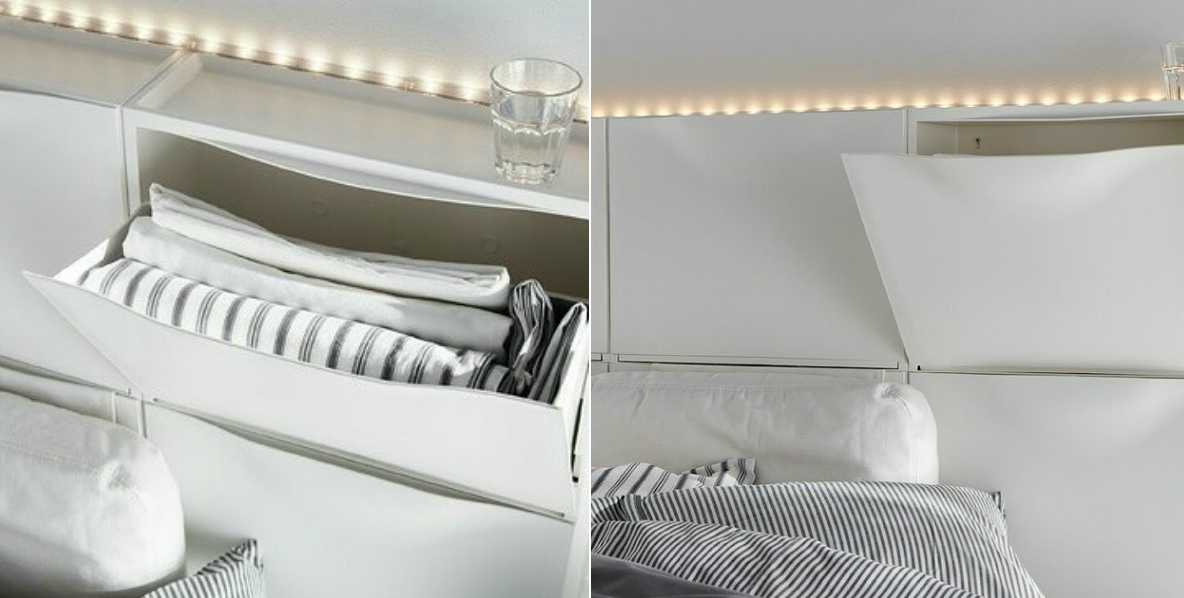 Несколько настенных галошниц, ящиков или полок, подобранных в цвет кровати и расположенных в ее изголовье, помогут организовать стильное хранение постельного белья, книг, журналов и других мелочей.