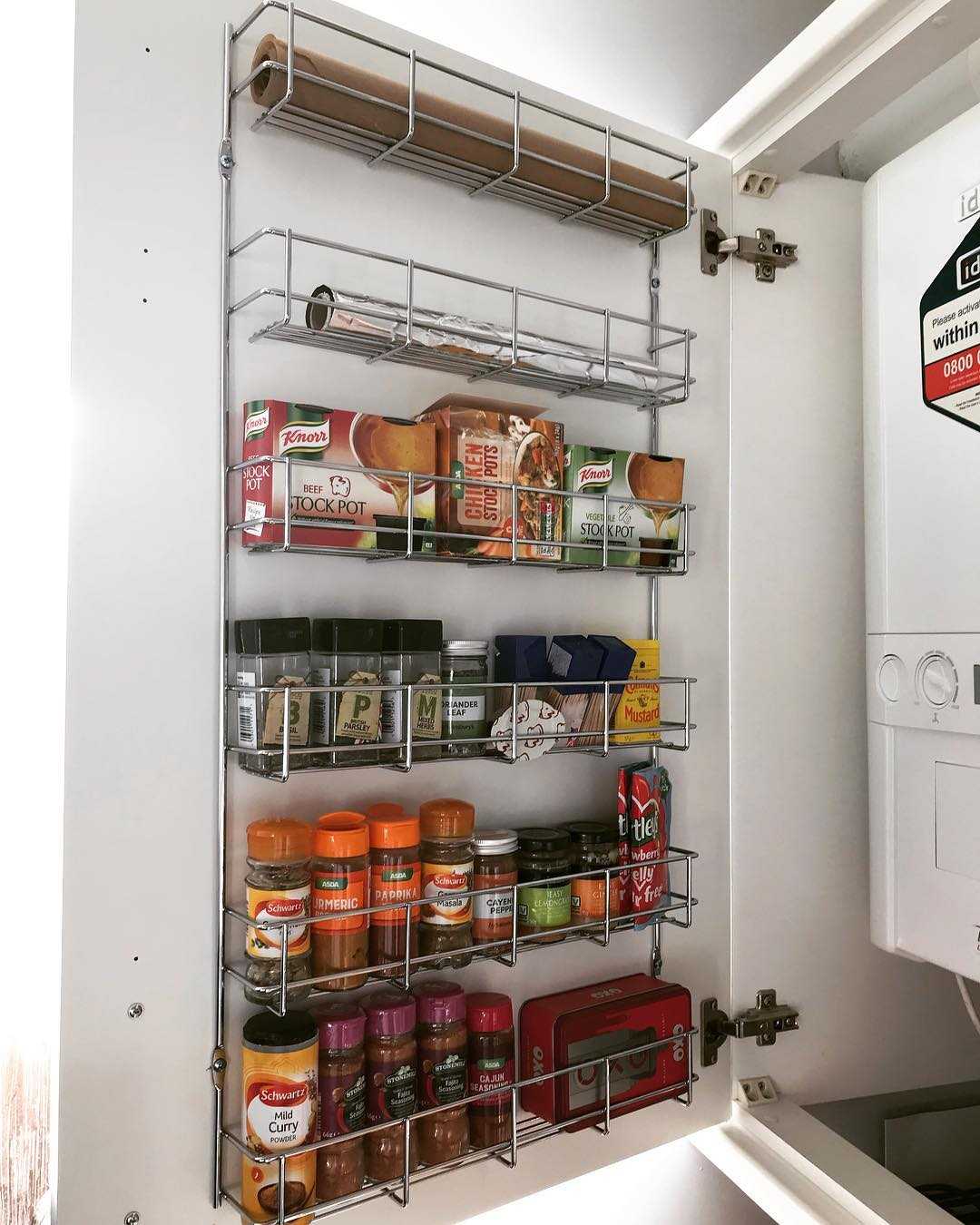Внутренняя сторона дверей шкафчиков может стать замечательным помощником в организации дополнительного хранения. Владельцы маленьких квартир особенно оценят эту идею: таким образом, к примеру, можно компактно и удобно разместить баночки со специями на кухне.