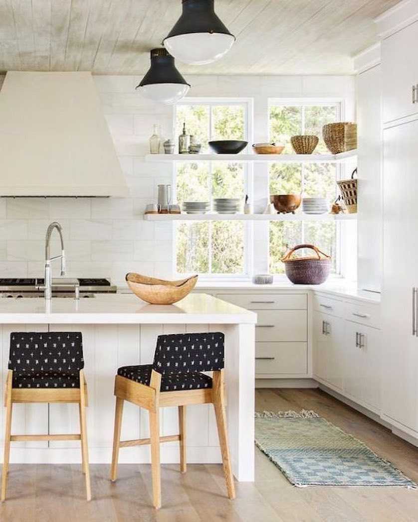 Расширить потенциал кухонного гарнитура можно, дополнив его аккуратными открытыми полками под навесными шкафчиками. Простое, лаконичное и практичное решение.