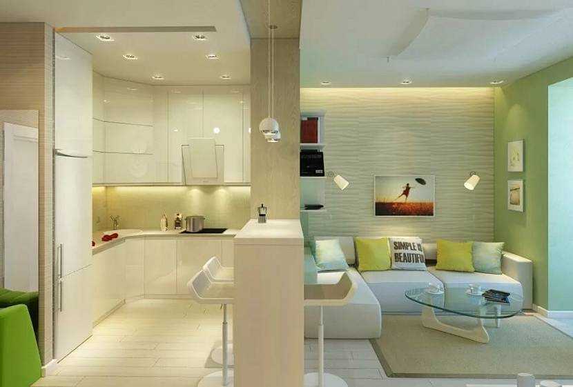На кухню в однокомнатную квартиру лучше выбирать встроенную технику и мебель, созданную по параметрам комнаты. Стол должен быть или маленьким (если вы нечасто принимаете гостей), или раскладным. Если в квартире проживает один-два человека, можно и вовсе обойтись барной стойкой.