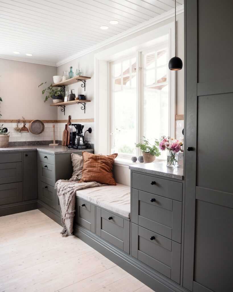 Если нужна кухня в традиционном стиле, стоит выбрать модули из серии “Лерхюттан”. Прямые линии и четкие рамы фронтальных панелей делают интерьер лаконичным и стильным. Доступные цвета фасадов – светло-серый и черный.