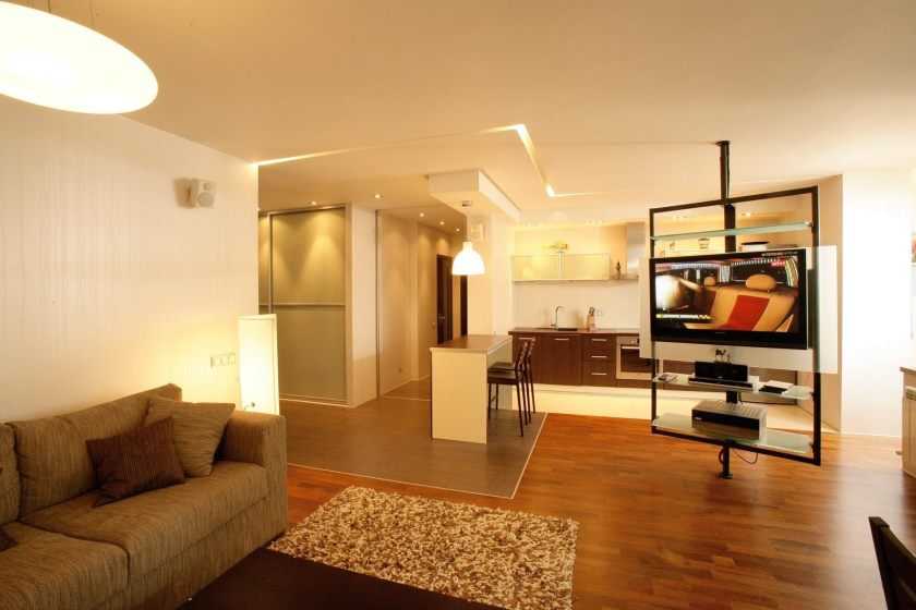 Чтобы в однокомнатной квартире разместить все необходимое, дизайнеры советуют объединить жилую комнату с кухней – сделать квартиру-студию. Тогда появляется возможность сделать комфортабельную кухню-гостиную. Однако такая радикальная перепланировка требует получения официального разрешения на снос стены, установки дополнительной вентиляции. Посмотреть на варианты дизайна квартиры студии 45 кв м можно на фото.