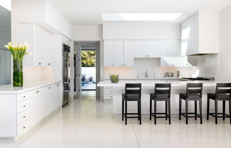 Часто используют светильники с абажурами из матового стекла или пластика. Также уместны скрытые галогенные и светодиодные лампы с белым светом. Освещение должно быть точечным и симметричным. Такие приемы помогут создать максимально светлое помещение с равномерным распределением света по всей его территории.