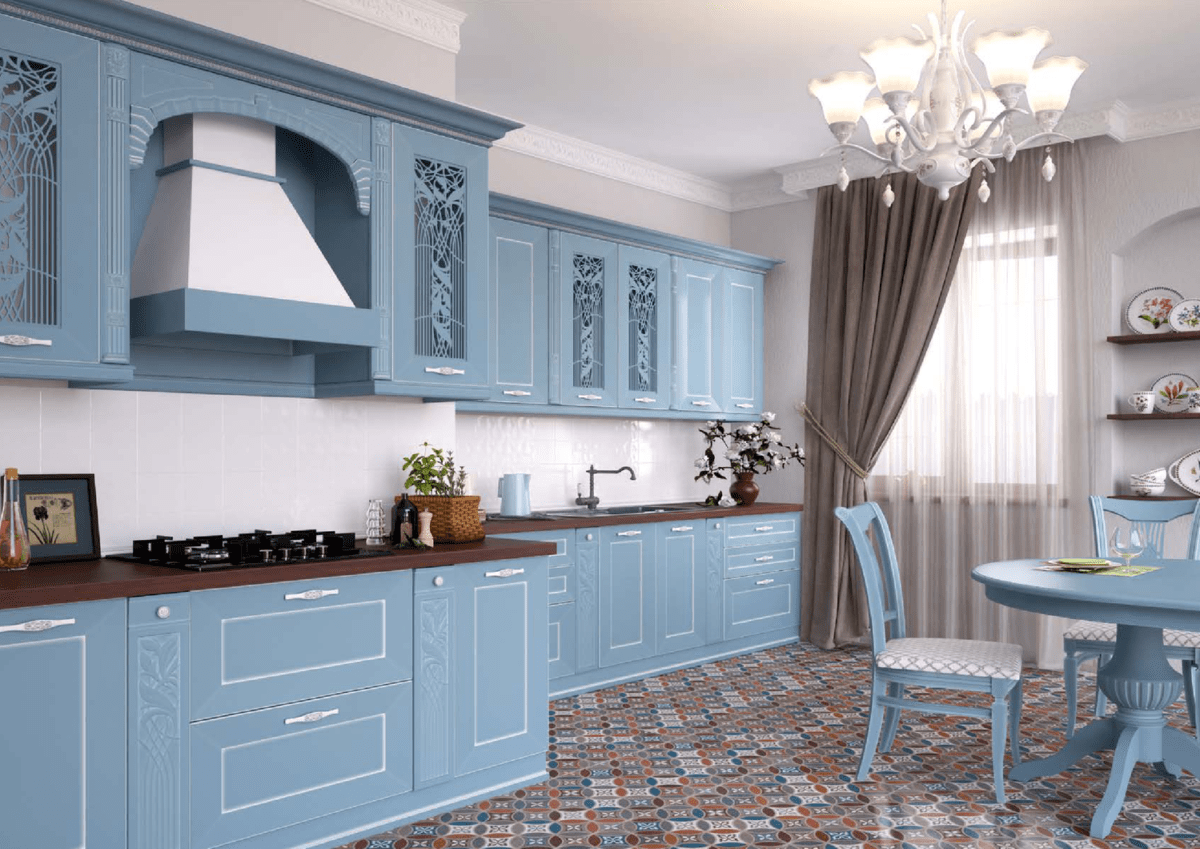 - Он положительно влияет на пространство. Холодный оттенок способен визуально делать помещение больше. По этой причине хозяева маленьких, узких, с низкими потолками кухонь предпочитают оформление в этой цветовой гамме.