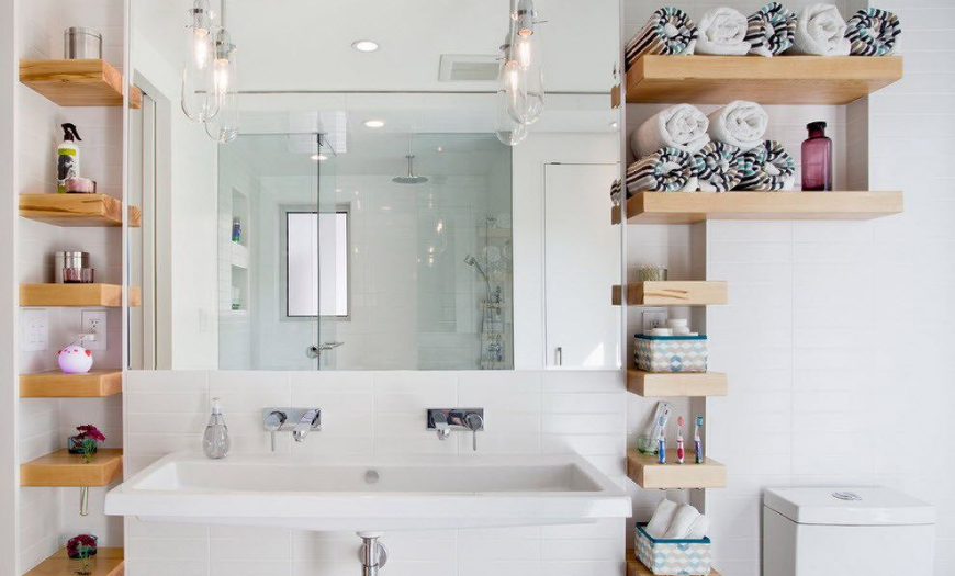 Продумайте место для хранения предметов и средств для уборки, если они будут храниться в ванной комнате. Возможно создать шкафчики, подвешенные над дверью.