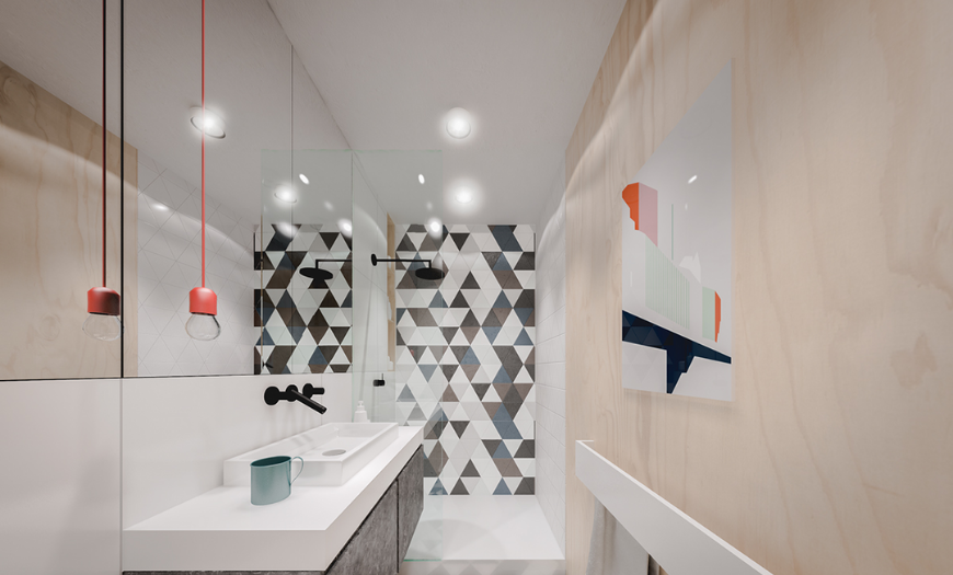 Правильное оформление поверхностей прячет недостатки комнаты. Диагональная укладка кафеля на полу поможет визуально увеличить маленькое помещение.