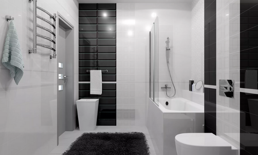 Сочетание цветов в общей композиции ванной выбирается в двух основных цветах. Контрастные решения делают восприятие более интересным, а два конкурирующих цвета создают иллюзию большого пространства. Дополнить эту иллюзию поможет правильно организованное потолочное пространство и освещение комнаты.
