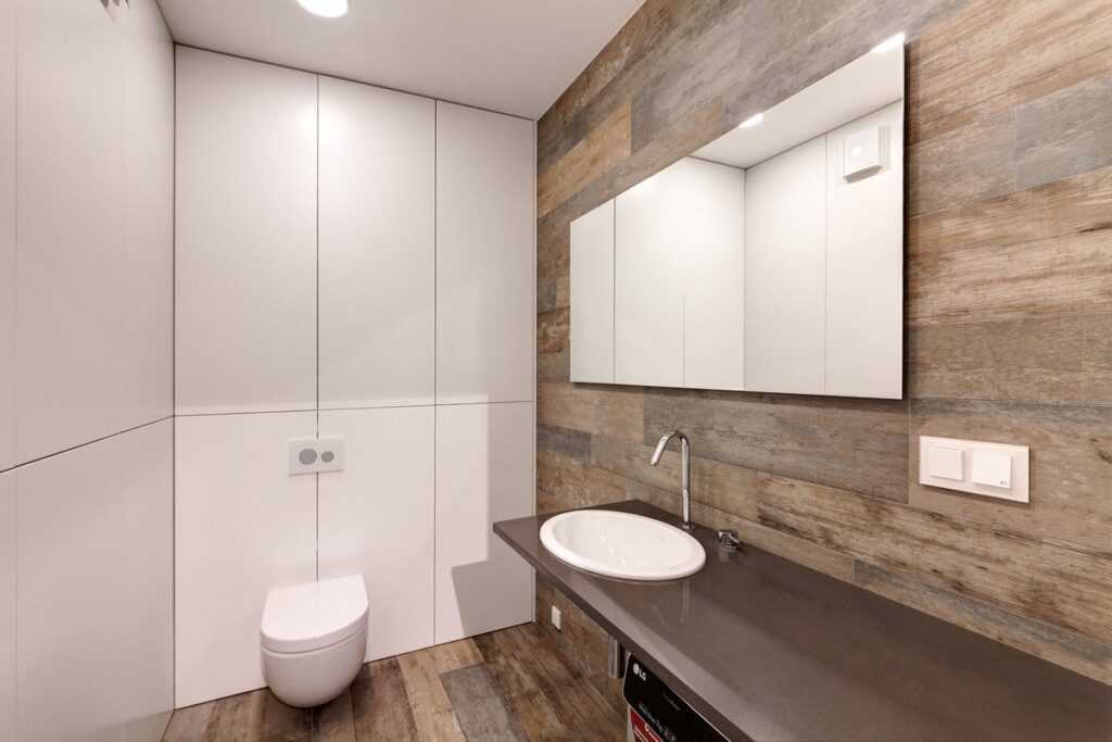Туалет лучше выбрать подвесной (монтированный в стену), поскольку он более удобный и занимает меньше места. Кроме того, такая конструкция позволяет мыть пол под ним (грязь и влага не скапливаются вокруг). Свободный пол визуально делает пространство менее загроможденным.