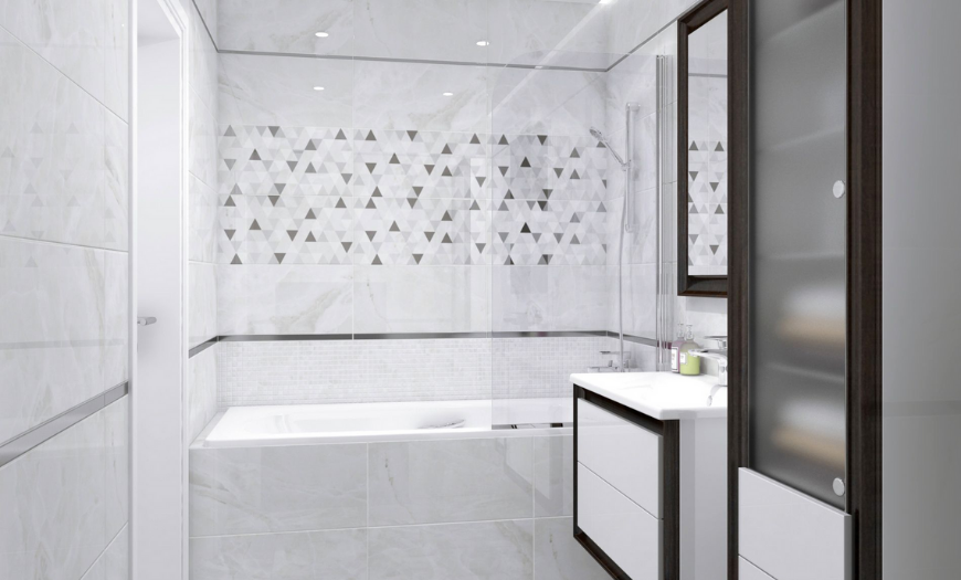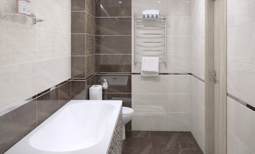 Контраст цветов обеспечивается использованием и применением плитки разных расцветок на поверхностях, подчеркивающих форму помещения, например, на смежных стенах или выступах, закрывающих коммуникации дома