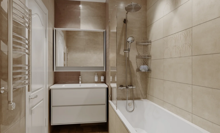 Например, проблему нехватки места решит душевая кабина с раздвижными створками и сливом в полу. На стене с помощью плитки можно создать ниши и полки, для банных принадлежностей.