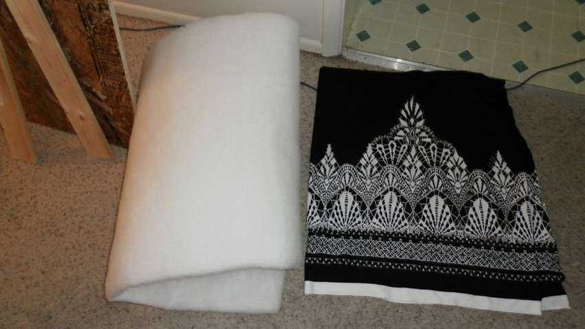 Кладем поролон на основу и маркером отмечаем места для проделывания отверстий. В этих местах делаем дырки диаметром не более 8 мм. Клеем поролон к фанере так, чтобы отверстия на этих двух материалах полностью совпадали. Сверху кладем синтепон с запасом, чтобы по краям было больше на 5 см. Размещаем основную ткань с запасом около 10 см по всему периметру. Переворачиваем фанеру со всеми материалами на ней, и при помощи мебельного степлера закрепляем ткань с изнанки.