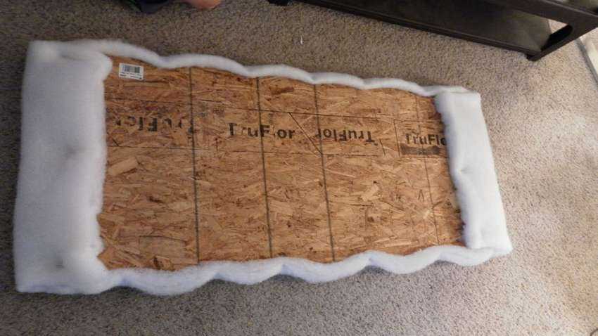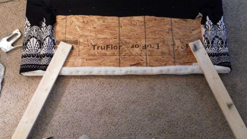 Когда основание будет готово, вырезаем поролон. Его необязательно прикреплять. Если планируется выполнение стяжки обивки, элементы крепления будут удерживать и наполнитель. Однако со временем поролон может деформироваться, местами просядет, что ухудшит внешний вид изделия.