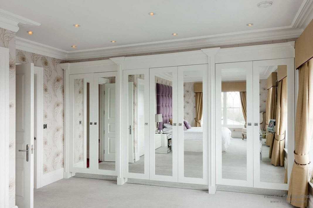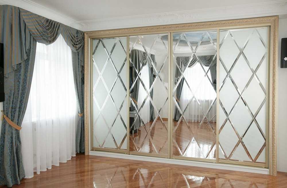 Шкаф-купе в спальне с зеркалом популярный и востребованный элемент, не требуется отдельного места для рамы. На зеркале выполняют пескоструйные рисунки.