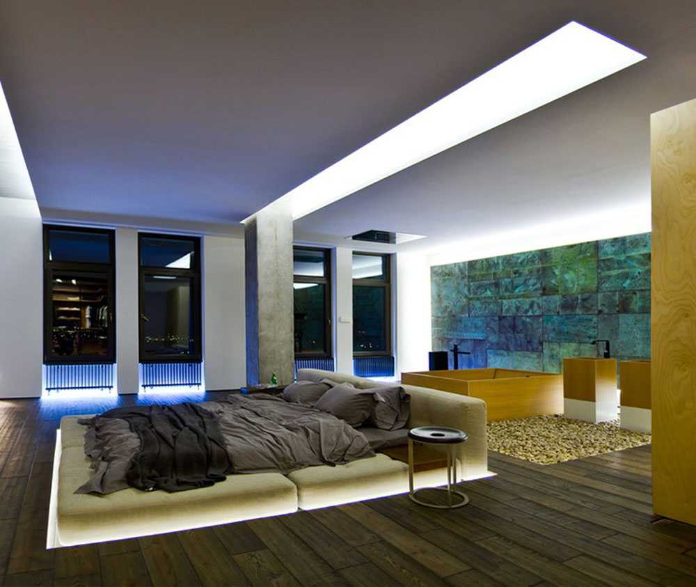 Декоративная подсветка в современном интерьере придает ему легкие нотки футуризма. Светодиодные ленты используют в больших комнатах при оформлении «парящих» потолков. А если протянуть ее по периметру кровати или подиума – будет ощущение, что ложе летает в невесомости. Ничуть не хуже смотрятся небольшие встроенные светильники в нишах, на полках шкафов и в модульных стеллажах.