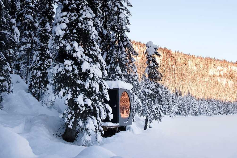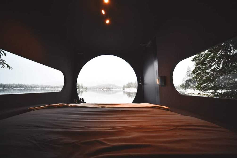 Это один из набирающих популярность в Норвегии «птичьих домов». Он окружен огромными заснеженными елями с трех сторон и сливается с природой благодаря минималистичному оформлению. Интерьер микродома детально продуман: например, в основании кровати выведены розетки, чтобы гостям было удобно заряжать гаджеты. В изножье стоит мягкий кожаный пуф, рядом расположен миниатюрный кофейный столик — ничего лишнего, но очень уютно.