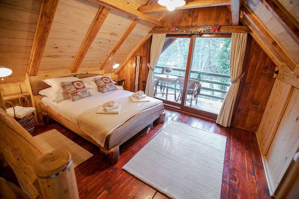 Гостиная в бунгало объединена с маленькой кухней. Санузел с душевой расположены отдельно, а спальня находится на втором ярусе. Из панорамного окна открывается роскошный вид на окрестности. Горячую воду обеспечивает проточный водонагреватель, а вечерами домик согревается электрическим обогревателем.