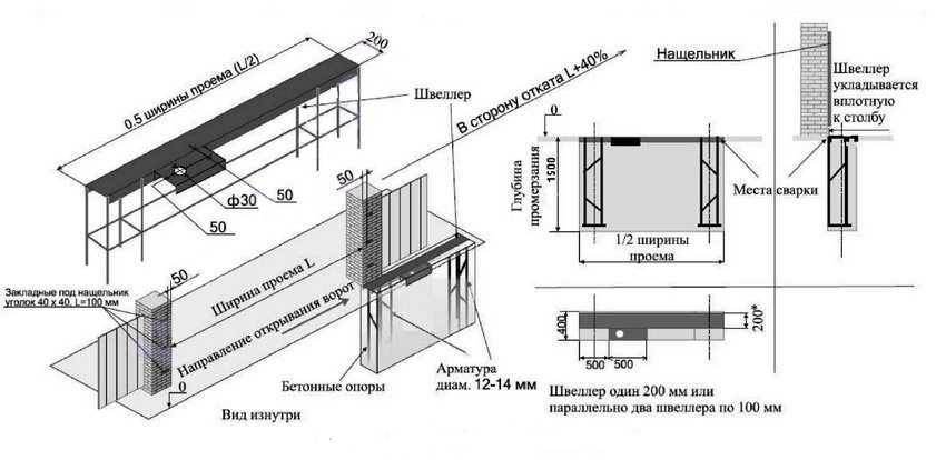 Далее делается фундамент для опорной зоны. Для этого вырывается траншея глубиной 1,5-2 м и длиной вдвое меньше проема ворот. Нарезается арматура такой же длины и несколько штук 20 см и помещается в углубление. Закладная опускается, а швеллер равняется по верхнему уровню земли. После этого яма заполняется бетоном. По технологии бетонное покрытие нужно выдержать около 4 недель.