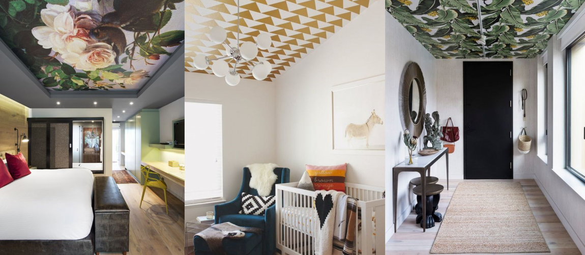 Эффектное и бюджетное решение. В идеале такие акцентные потолки должны сочетаться с нейтральными однотонными стенами. Если покрыть потолки и стены идентичными обоями с активным рисунком, вы получите давящий на психику эффект «внутри шкатулки».