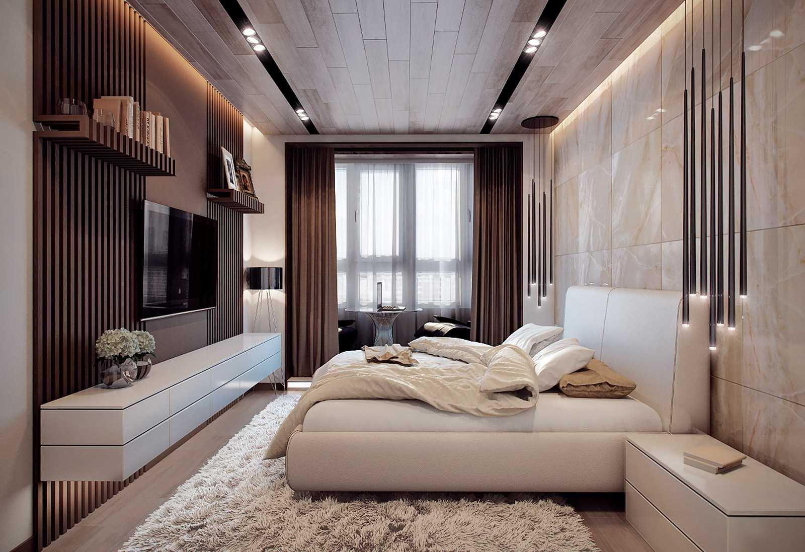 Небольшой по площади потолок правильнее сделать ровным. Его нет необходимости обременять массивными светильниками. В маленьком пространстве свет может литься из расположенных по периметру стен встроенных ламп и настенных бра. Таким решением убиваются сразу два зайца: