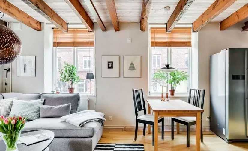 Скандинавский стиль в доме идеально подходит для маленькой кухни-гостиной, в которой даже после объединения мало пространства. Светлые тона расширяют интерьер, а в сочетании с минимализмом эффект усиливается.