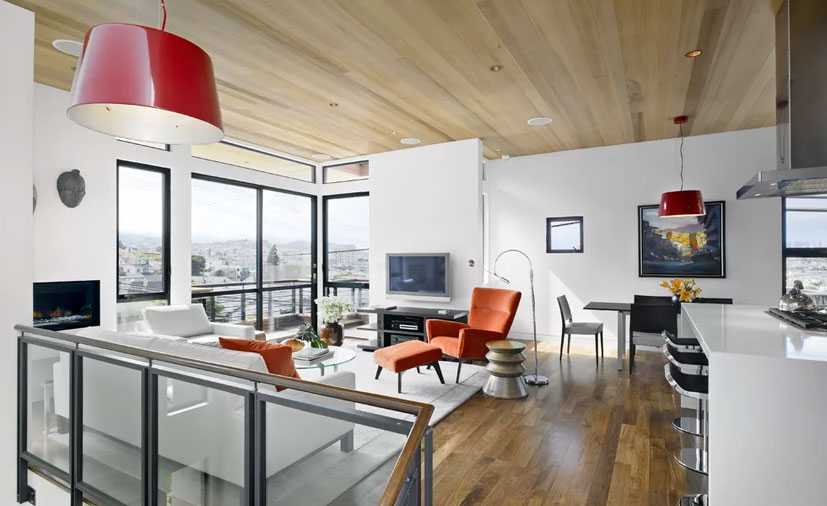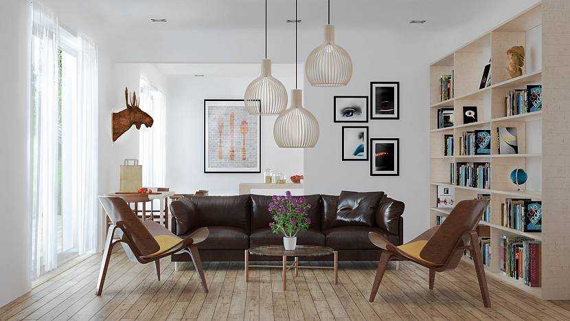Гостиная для выполнения своих функций должна быть достаточно просторной, поэтому иногда для этой цели её объединяют с кухней. Для создания простора также играет важную роль минимальное количество вещей, то есть в дизайне гостиной в скандинавском стиле помимо дивана, столика, кресла и полок практически ничего и не используется.