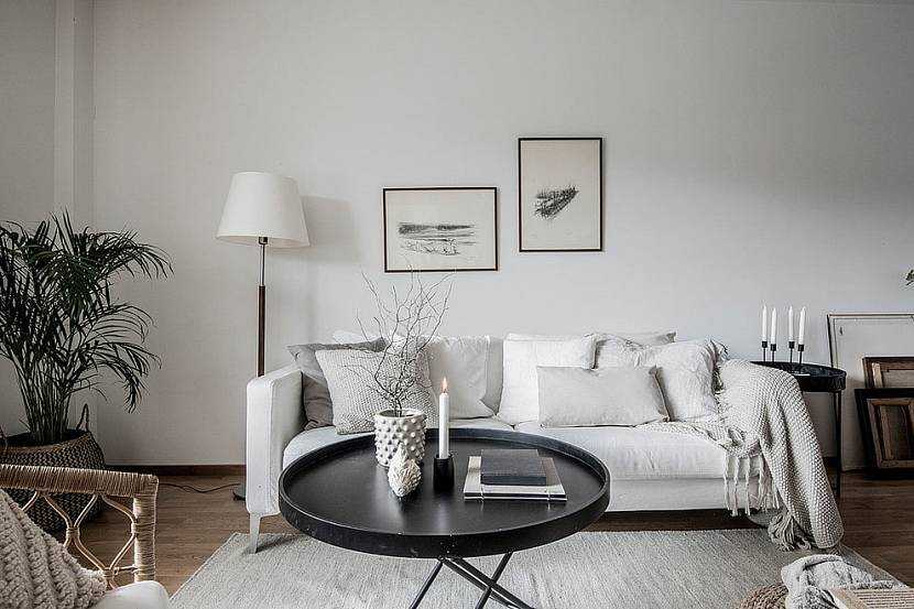 Цвет дивана в скандинавском стиле традиционно белый, светло-серый или с легким сливочным оттенком. В современных гостиных встречаются диваны коричневого, синего и черного цвета, что обусловлено желанием создать более контрастную обстановку.