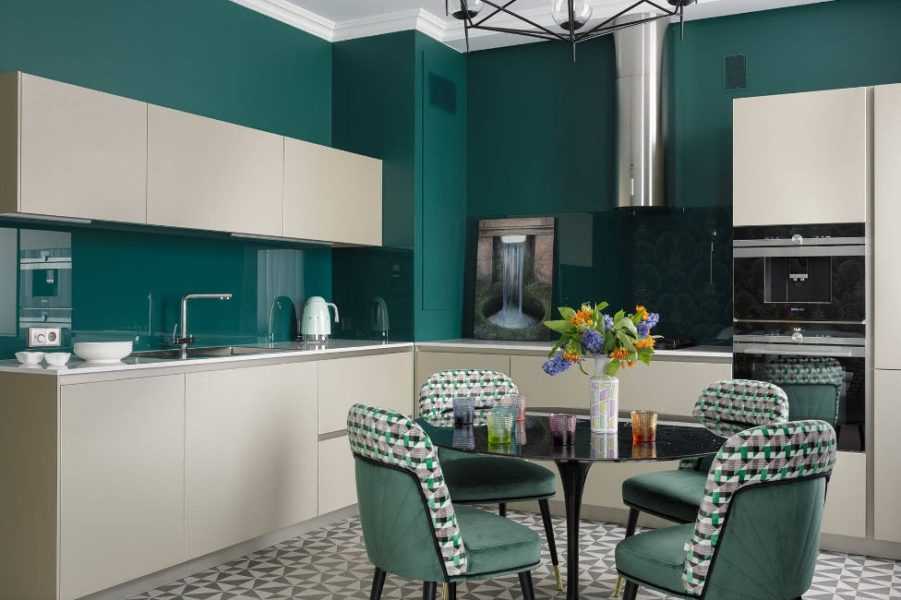 На кухне сочетание цветов играет особую роль. Некоторые оттенки могут способствовать появлению аппетита, другие ухудшают его. Выбор палитры зависит от индивидуальных потребностей человека. Изумруд в интерьере кухонного пространства чаще используют в качестве холодного сочетания. Его рекомендуют добавлять акцентом, например, выбирать шторы или фартук данного цвета.