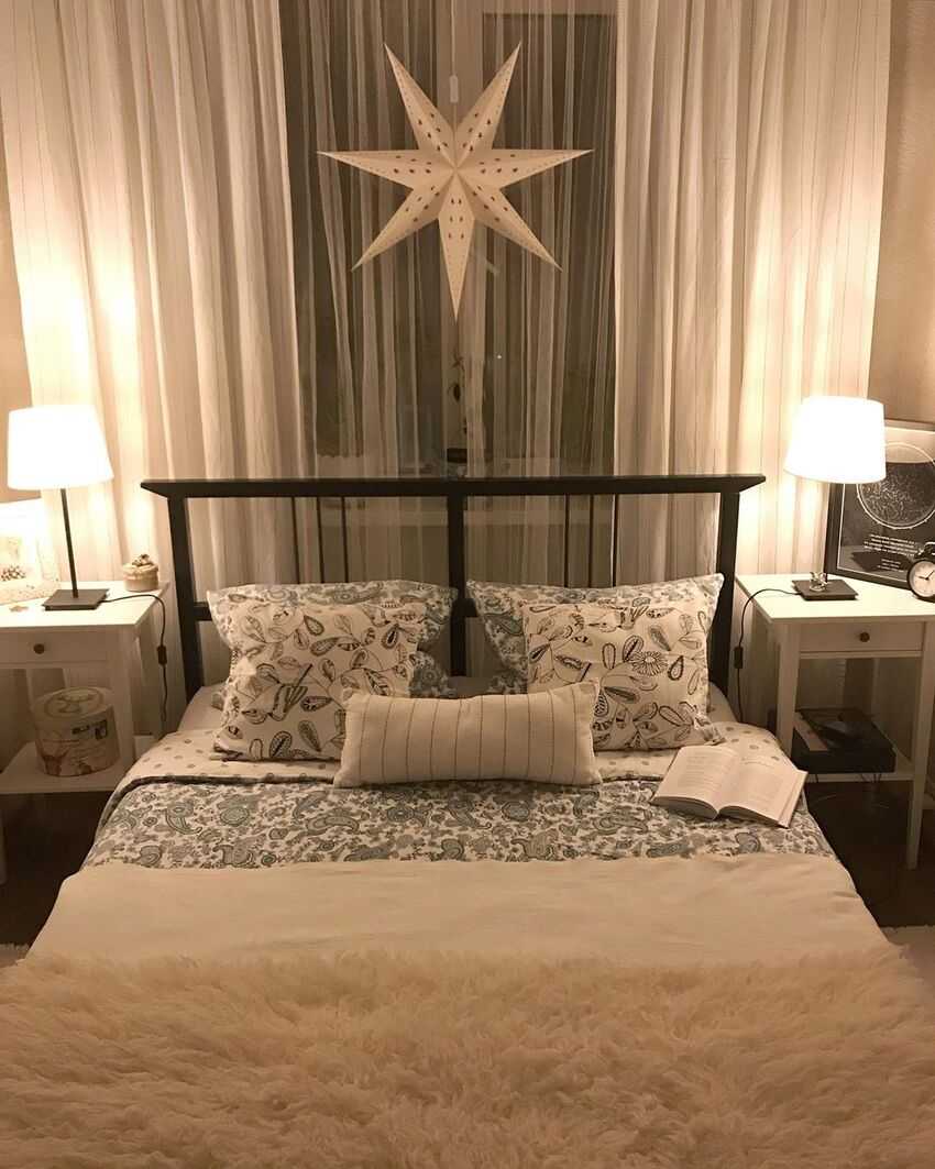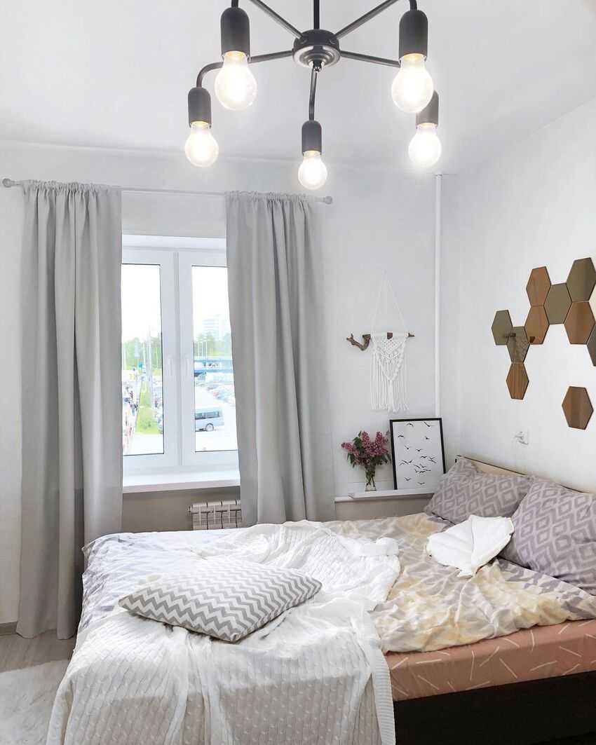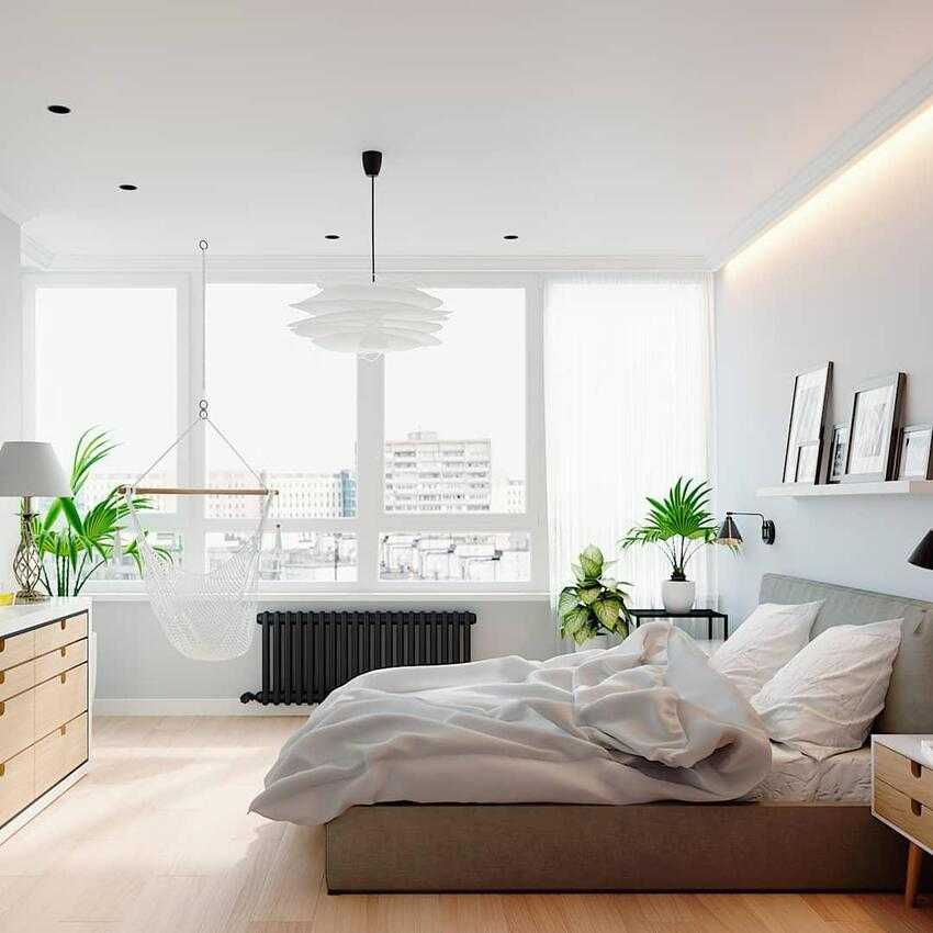 Традиционно спальня в скандинавском стиле должна быть наполнена светом. Большие окна и прозрачные занавески обеспечат хорошее естественное освещение в дневные часы. Для наполнения комнаты светом в тёмное время суток необходимо позаботиться о нескольких его источниках.
