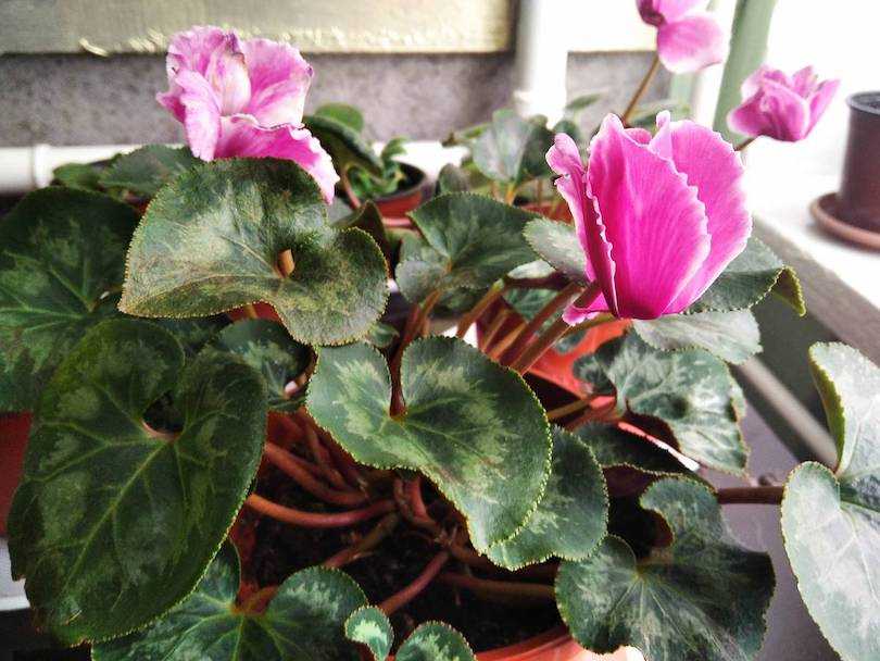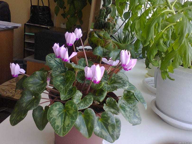 Немаловажен и следующий факт: цикламен лёгок в уходе: опрыскивать альпийскую фиалку нужно нечасто, а оптимальная температура составляет около +12 -+20°С, поэтому такие цветы отлично подойдут для офиса.