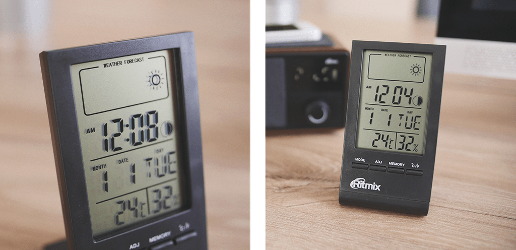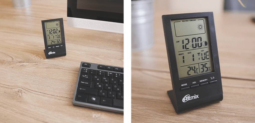 Метеостанция Ritmix CAT-040 — компактное и стильное устройство, которое выводит на дисплей данные о температуре и влажности в комнате. Нужно лишь поглядывать на перепады и вовремя регулировать работу сплит-системы, а также при необходимости включать электрический увлажнитель воздуха. Кроме того, CAT-040 можно использовать как настольные часы, отслеживать фазы Луны и данные о погоде за окном. Благодаря работе от батарейки, ты сможешь легко перемещать метеостанцию между комнатами или брать с собой в поездки.