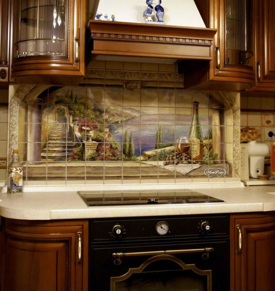 С помощью рисунка можно добиться визуального расширения кухонного пространства. Для фартука применяются панно с рисунок или одиночные фрагменты плитки кабанчик с изображениями, подходящими по тематике или дополняющие кухонный гарнитур или отделку.