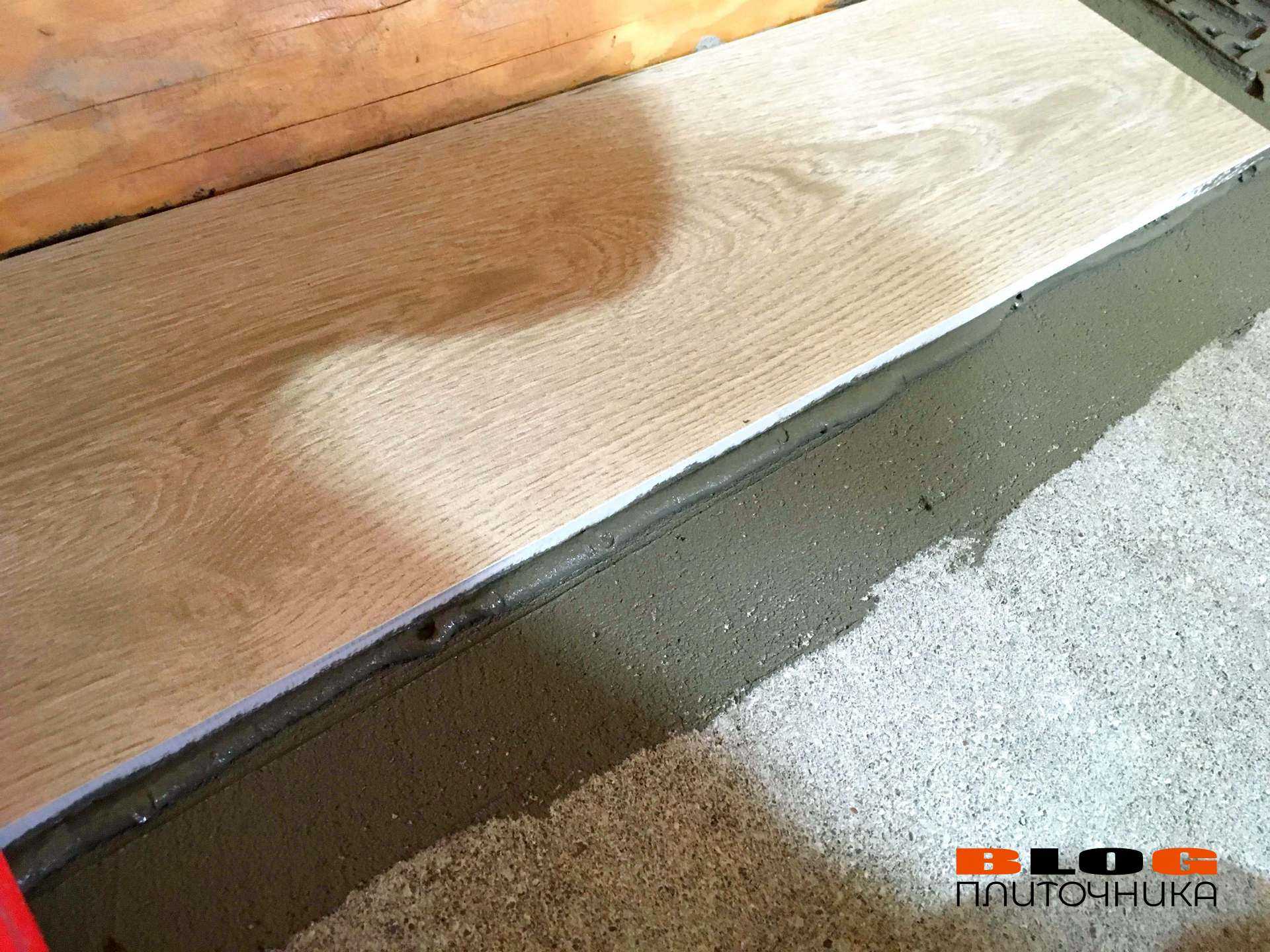 Уложили плитку без СВПЗдесь думаю комментарии излишни. Длинный керамогранит под дерево (даже если он не имеет большой кривизны) укладывать нужно только с СВП. По крайней мере в тех случаях, если вы стремитесь чтобы между плитками не было перепадов.