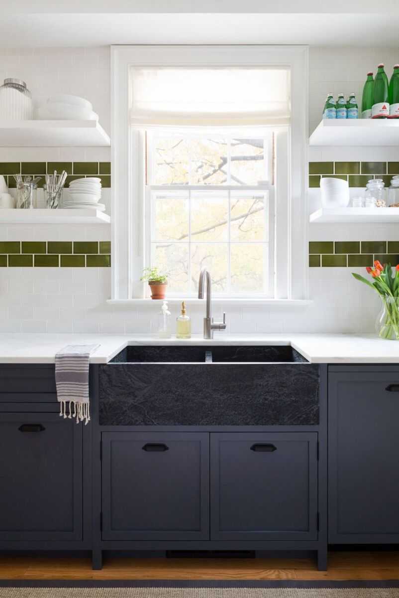 Фартук из разных оттенков делает рабочую зону кухни ярче, создавая акцент. Сочетать нужно цвета из одной группы по теплоте.