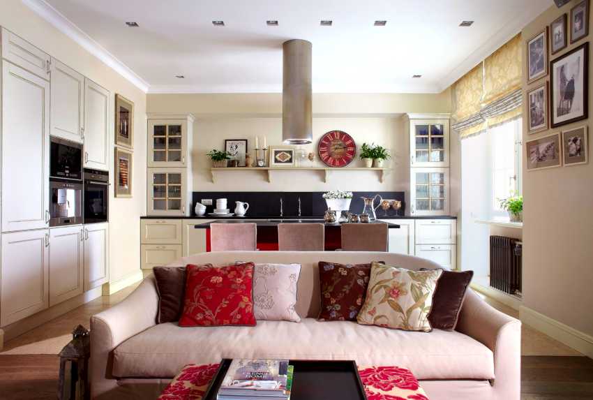 диван с подушечками в интерьере кухни совмещенной с гостиной