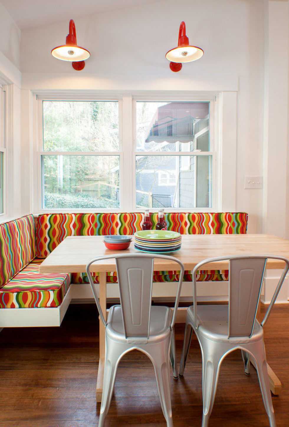 Что же касается обивки, то здесь не так уж и много вариантов. Кухня — это как раз то место в доме, где чаще всего падает и разливается то, что оставляет после себя грязные жирные пятна. Так что большинство экспертов в качестве обивки для углового кухонного дивана советуют выбирать кожу или заменитель кожи. Такой материал просто чистить и он не впитывает жир и красители.