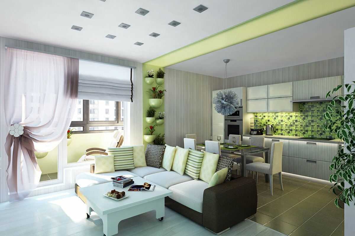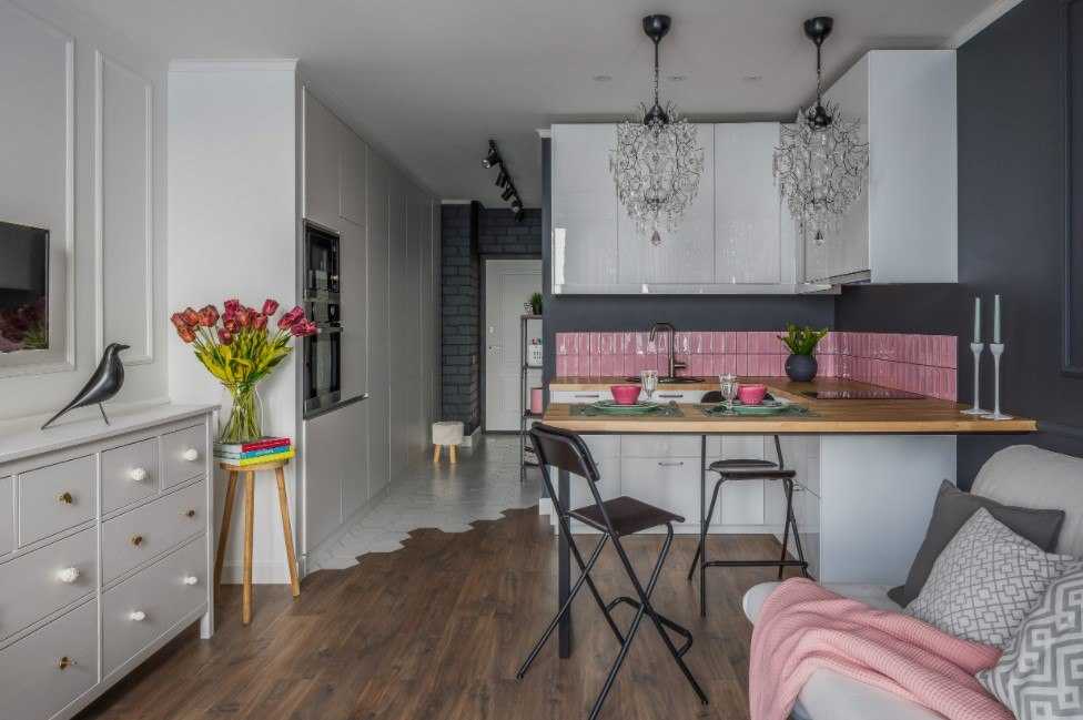 Другой вариант – выбрать 2-3 основных цвета и повторить их по всему пространству гостиной-кухни или квартиры-студии. Такие решения будут сглаживать резкий переход между зонами в пространстве.