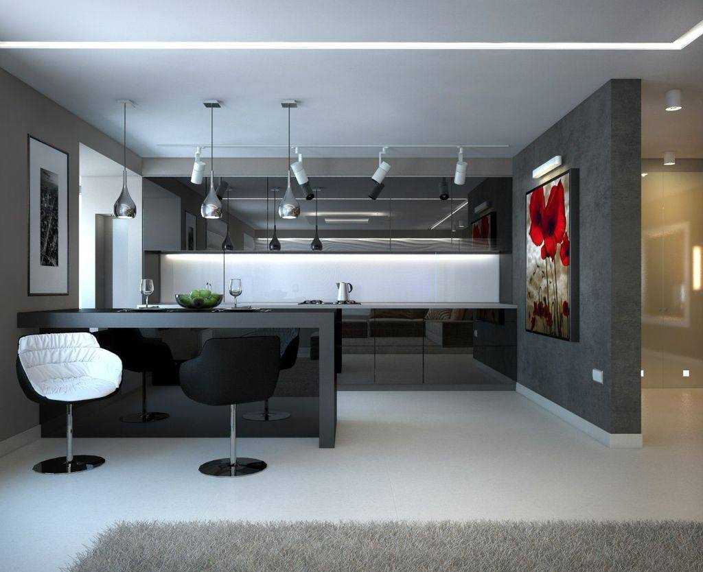 Для кухни-студии важно правильно оформить потолок, так как он выполняет роль разграничения зоны от самой кухни к гостиной. Потолок можно выполнить из гипсокартона, при условии, если помещение просторное