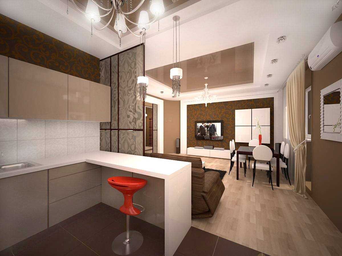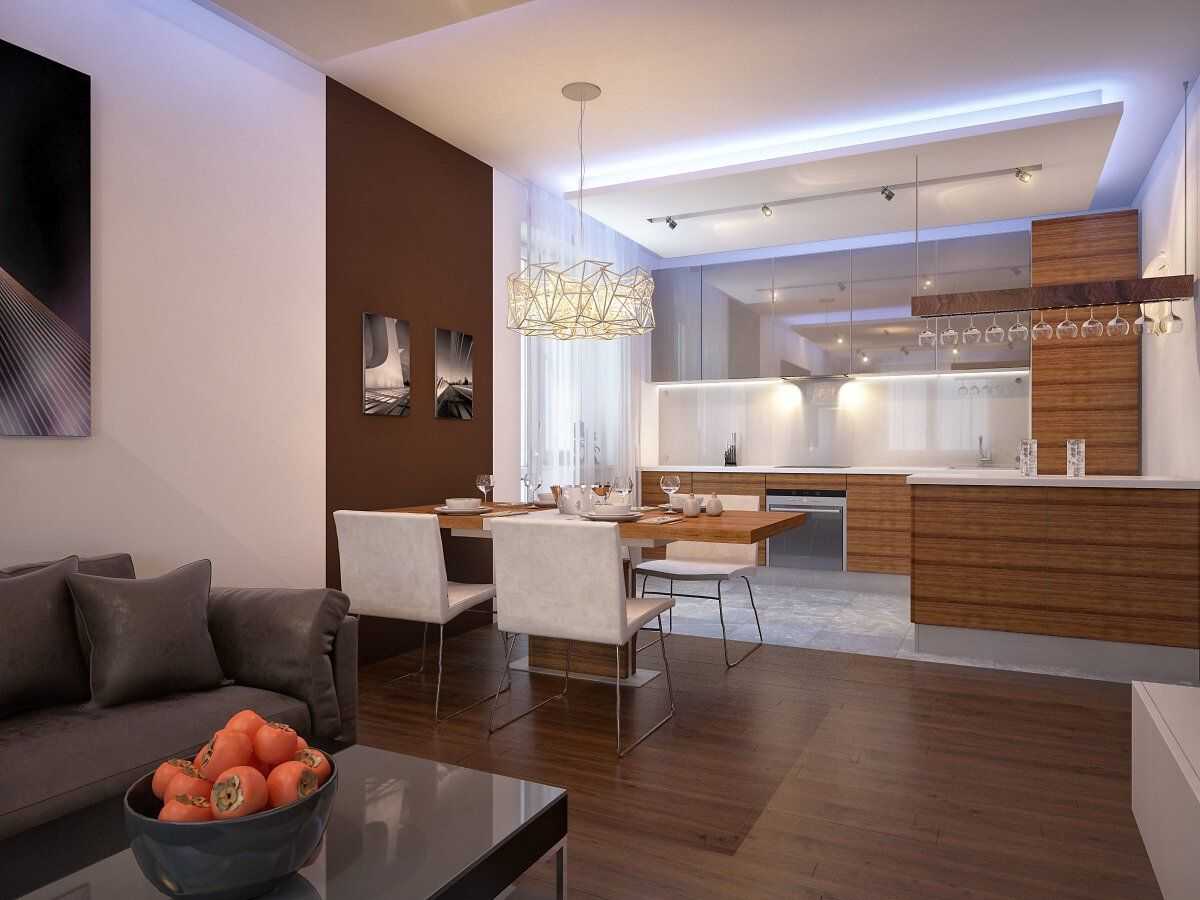 Чтобы объединенные помещения гармонировали друг с другом, их следует оформить в единой цветовой гамме, но тон кухни может быть чуть темнее, ярче, чем у гостиной. Также неравномерно следует распределять цветовые акценты, концентрируя их преимущественно в одной зоне.