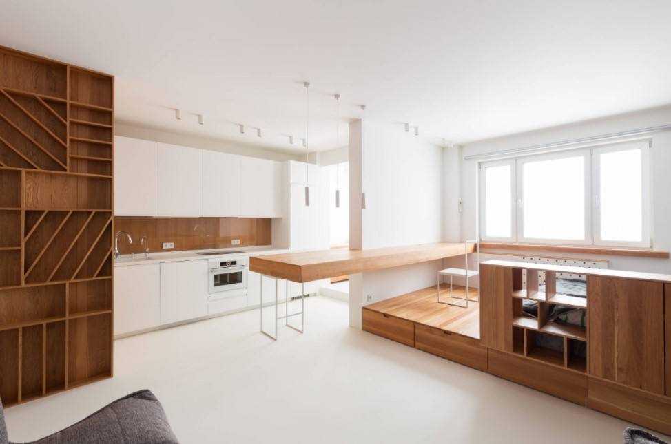Одна из самых популярных идей для кухни студии в 2022 году. Кухня в таком случае располагается на подиуме, что отделяет ее от гостиной. Кроме того, разноуровневые полы могут стать системой хранения, если расположить под ними небольшие ниши для вещей.