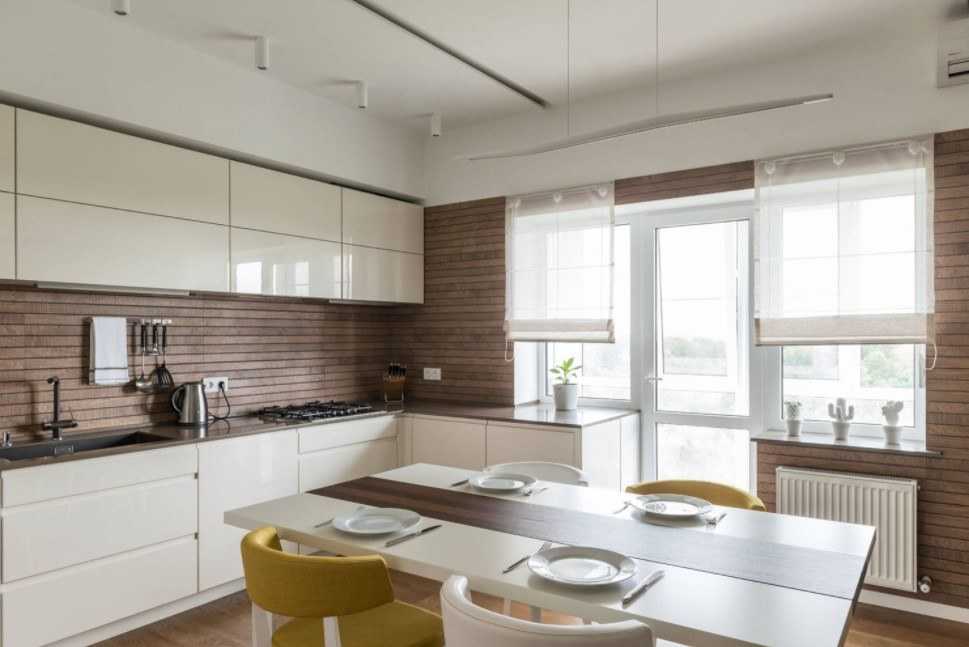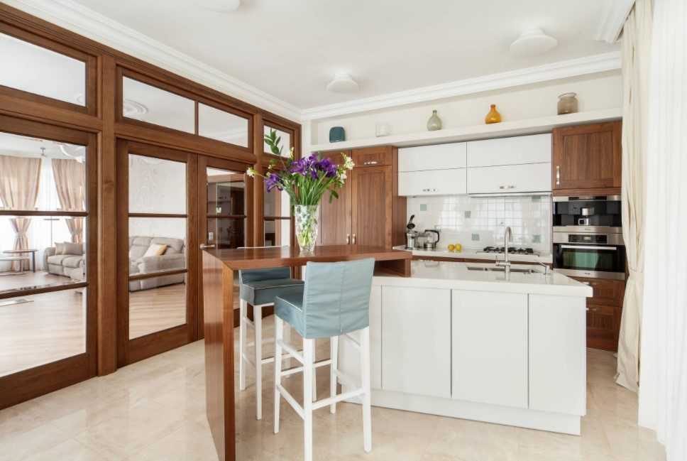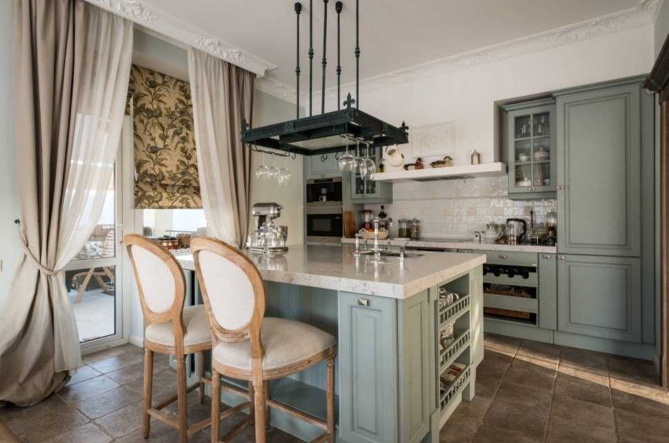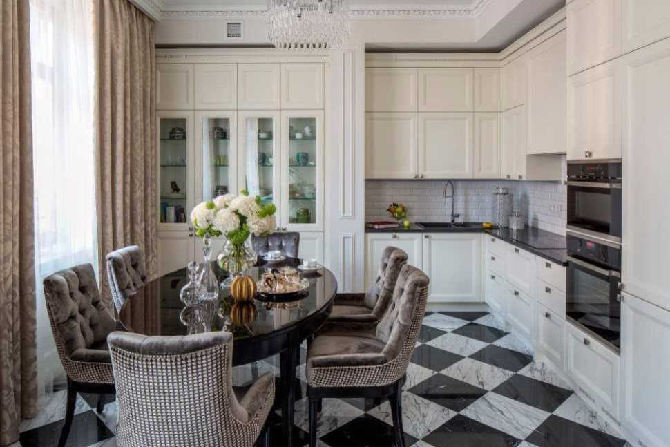 Неоклассика – наилучший дизайн для просторной проходной или совмещенной кухни частного дома. Главные требования этого стиля – большая площадь и высокие потолки.