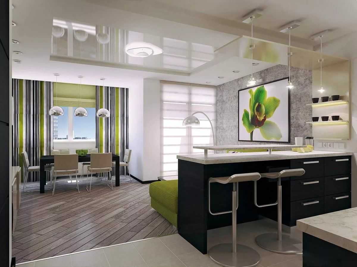 Встроенная барная стойка в интерьере большой кухни-студии в черно-белых тонах с яркими зелеными акцентами на мебели и элементах декора