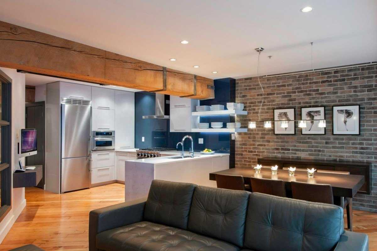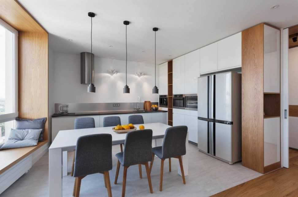 Совмещенная кухня в частном доме будет выглядеть динамичной и современной. Для воплощения идеи объединенного помещения хорошо подойдет модерн, минимализм и некоторые другие направления.