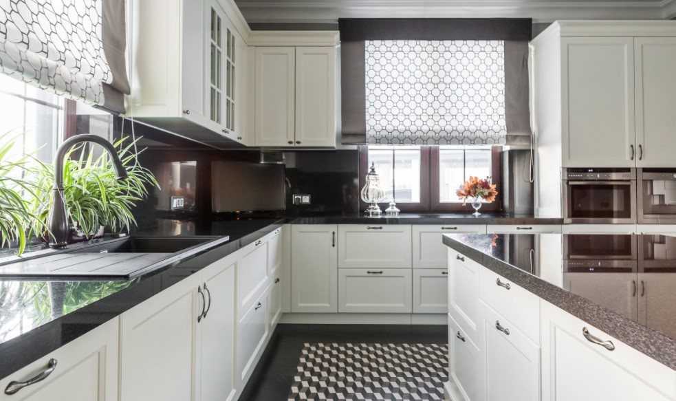 В оформлении классической кухни дизайнеры используют деревянные панели, текстильные обои, паркет, ламинат, керамоплитку. Столешницы из мрамора и гранита, двери с витражными стеклами, белый потолок с лепниной или натяжной потолок под роспись.