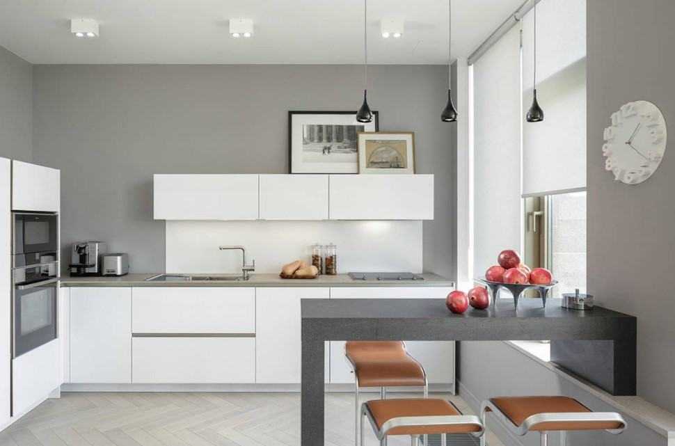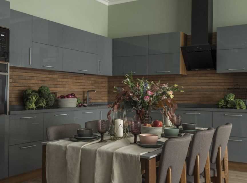 Будут популярны серые, бежевые, коричневые и голубые оттенки с черными и белыми акцентами. Светлая гамма подходит для основных стилей типа скандинавского, классического и неоклассического, а темная — к ар-деко, лофту и минимализму. Нужно помнить о том, что светлые стены визуально расширят площадь, а темные, наоборот, сузят. Чистый белый цвет для кухни будет крайне непрактичным выбором. Он быстро потеряет свежесть и потребует постоянного влажного ухода. Поэтому лучше выбрать светлые цветные тона.