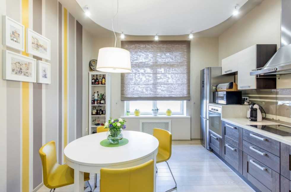 Границей между кухней и зоной отдыха могут служить легкие занавески или нитяные шторы, которые не утяжеляют пространство, но эффективно его разделяют.