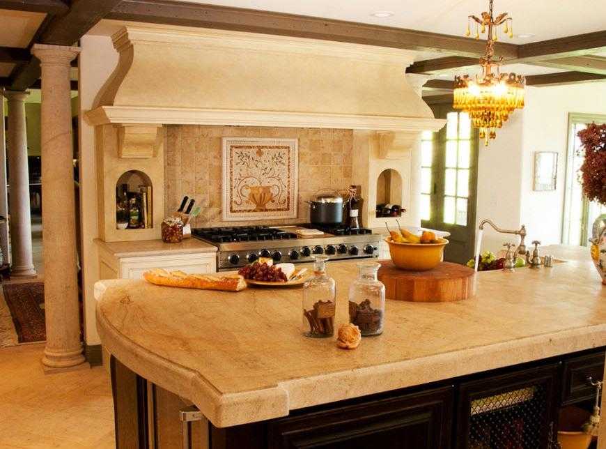 Не всегда можно позволить себе длинный стол в обеденной зоне, отмечающий центром провансальской кухни. Решением этой проблемы часто оказывается остров, который одновременно выступает в качестве рабочего пространства и места для хранения. Столешницы из натурального камня являются эффективным дополнением провансальского стиля на кухне. Они характеризуются не только исключительной декоративностью, но и высокой прочностью. Бывают двух вариантов: матовые и полированные.