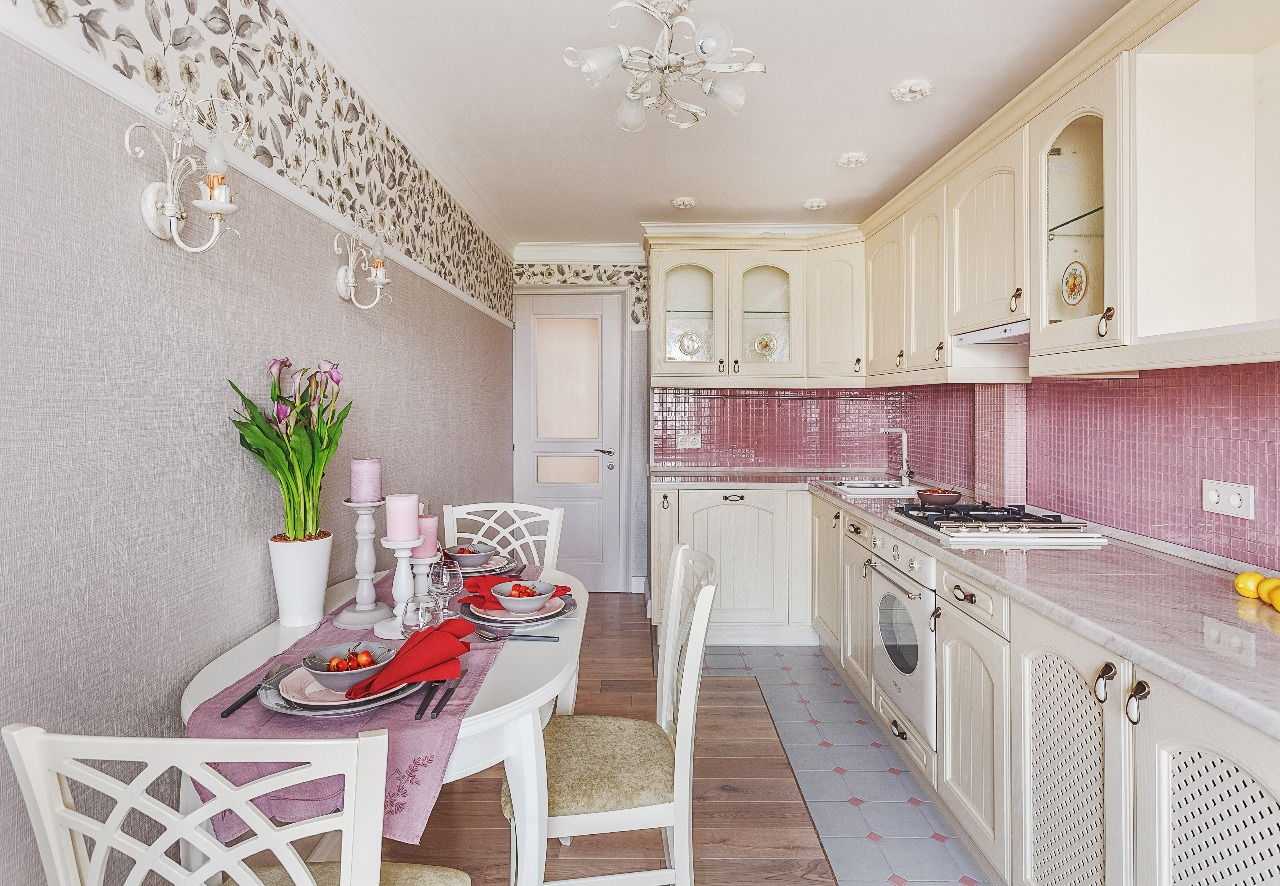 Простота такого интерьера обуславливает поиск соответствующих решений. Сюда подойдут обычные обои, в стиле прованс это бумажные полотна с мелким цветочным мотивом. Можно покрасить стены в выбранный тон, местами расставив акценты. Ими служит кухонный фартук рабочей зоны, как правило, облицованный керамической плиткой, отдельная полоса в столовой зоне.