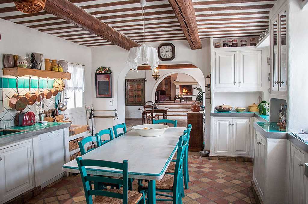 Для пола выбирают натуральную доску или керамическую плитку. Применим натуральный камень, тем более что в южных областях Франции обычно долго сохраняется тепло, для кухни нужны прохладные материалы. Именно такой будет минеральная порода.