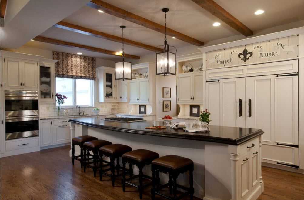 Потолок лучше всего оставить белым – покрасить или побелить. Если есть желание внести разнообразие в белое пятно над головой и усилить эффект деревенского колорита, добавьте грубых деревянных балок над головой.